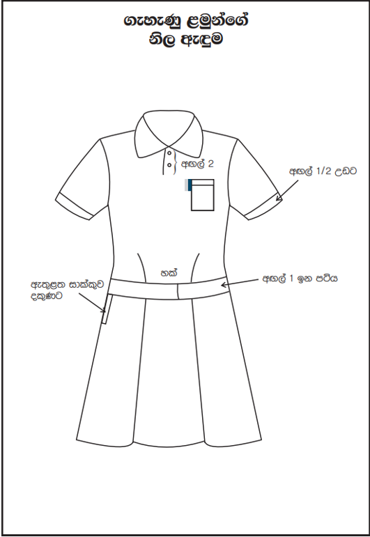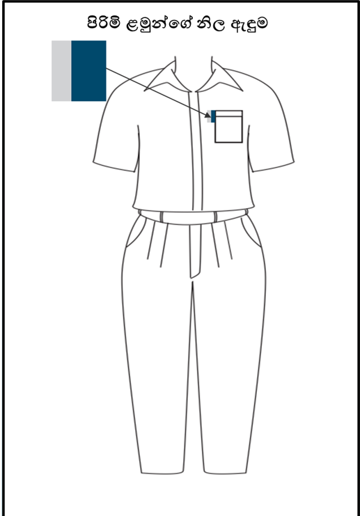 - සාක්කුවෙහි දකුණු පස ඉහළ කෙළවරෙහි පිටතට සිටින සේ පාසල් වර්ණ පටිය (COLOUR BAND) මැසිය යුතුය.